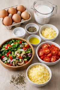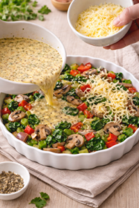 8. Spread vegetables evenly in the baking dish. Pour the egg mixture over the top. Add cheese lightly if using.