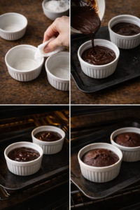 - Grease small ramekins and pour the batter evenly. Bake in a preheated oven until the edges are set but the center remains soft and molten. The top should look just firm, not dry.