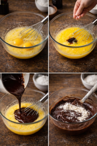 - In a separate bowl, whisk the eggs with sugar until just combined — no need to rush or overbeat. Add vanilla and a pinch of salt, then gently mix in the melted chocolate. Fold in the flour lightly, just until the batter comes together.