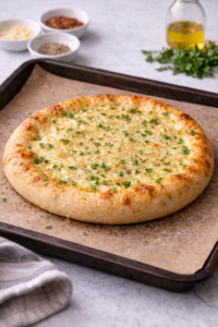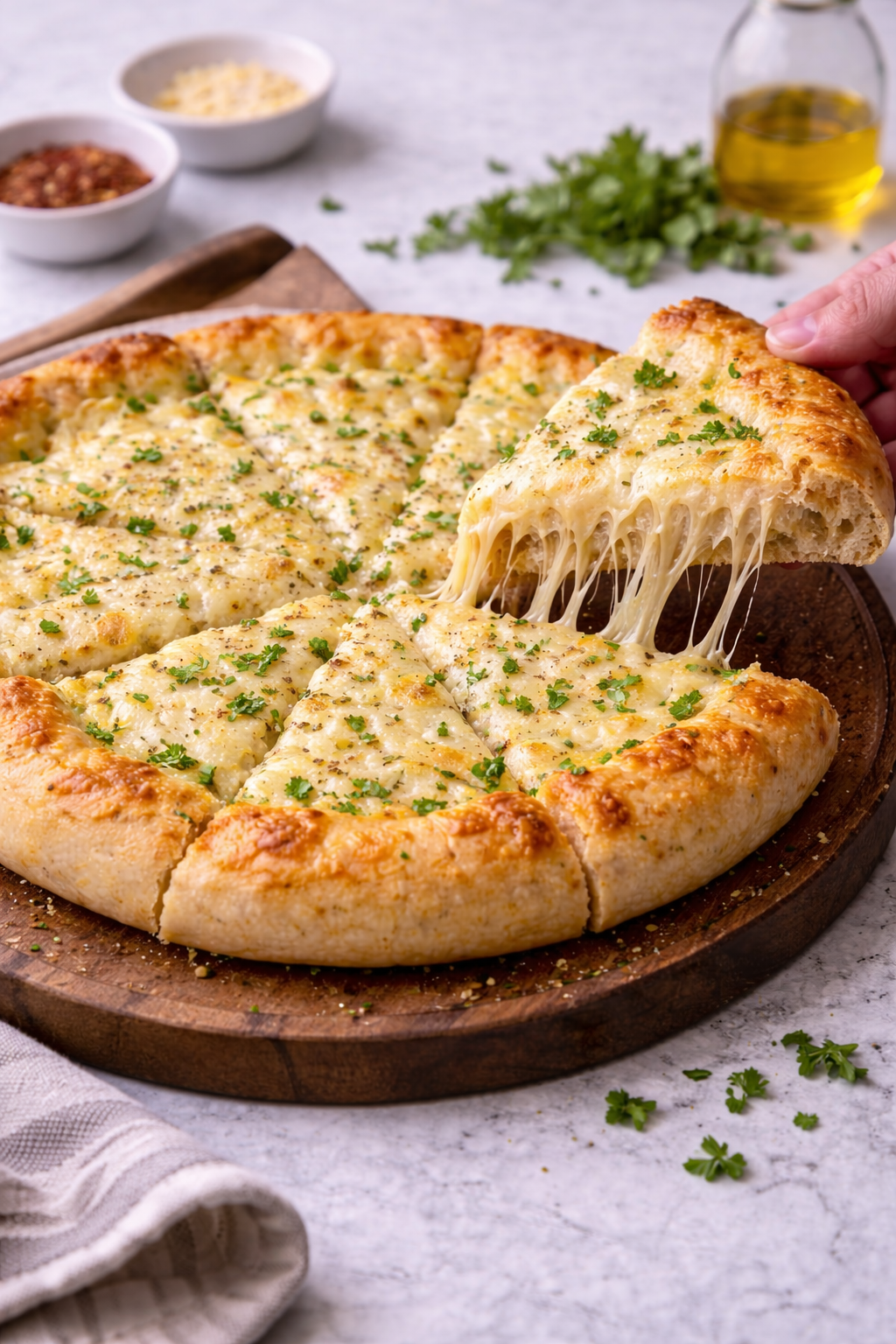A simple baked bread, golden on the outside, soft inside, holding melted cheese that stretches the moment you pull a slice away. No drama. No complexity. Just comfort doing its job.