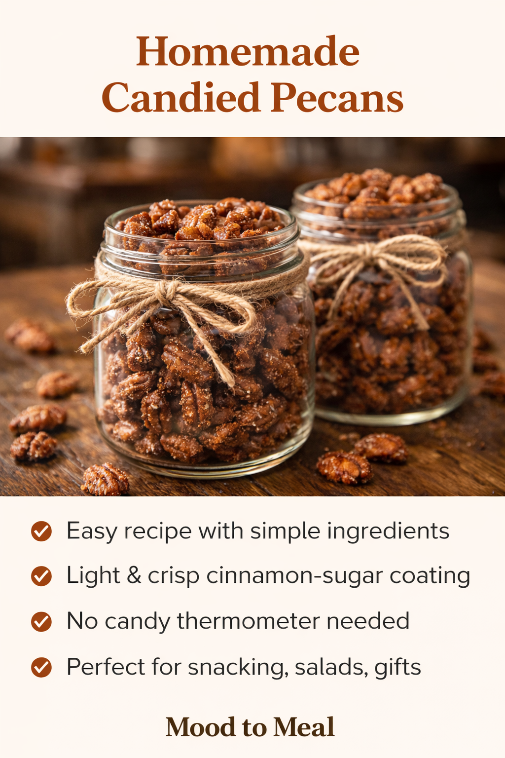 These candied pecans are crisp, lightly sweet, and warmly spiced. Not sticky. Not overly sugary. Just enough crunch and cinnamon to feel indulgent without tipping into excess. They’re the kind of snack you keep reaching for without realizing it—one more, then another—until the jar is mysteriously half empty.