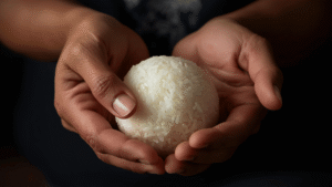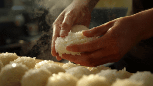 Before shaping, wet your hands lightly with water. This keeps the rice from sticking to your fingers. Rub a little salt on your palms — this adds flavor and helps preserve the rice if you’re packing it for later.