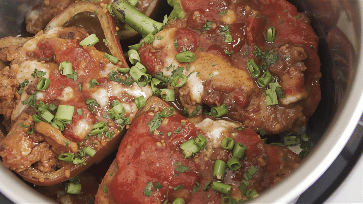 - Prepare the Pot: Pour beef broth and remaining tomato sauce into the Instant Pot. Place the stuffed peppers upright inside.