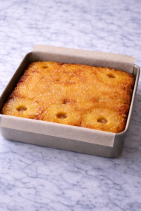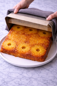 - When the caramel has settled but is still warm, flip the cake in one clean motion. No hesitation.