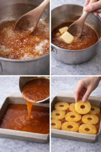 - Melt sugar slowly in a saucepan until it turns amber. Add butter and stir gently until smooth. Pour the caramel into a lined or greased pan. Arrange pineapple slices evenly on top. Take your time here.