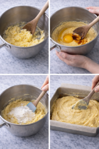 - Cream butter and sugar until soft, not fluffy. Add eggs one at a time, then vanilla. Mix gently.