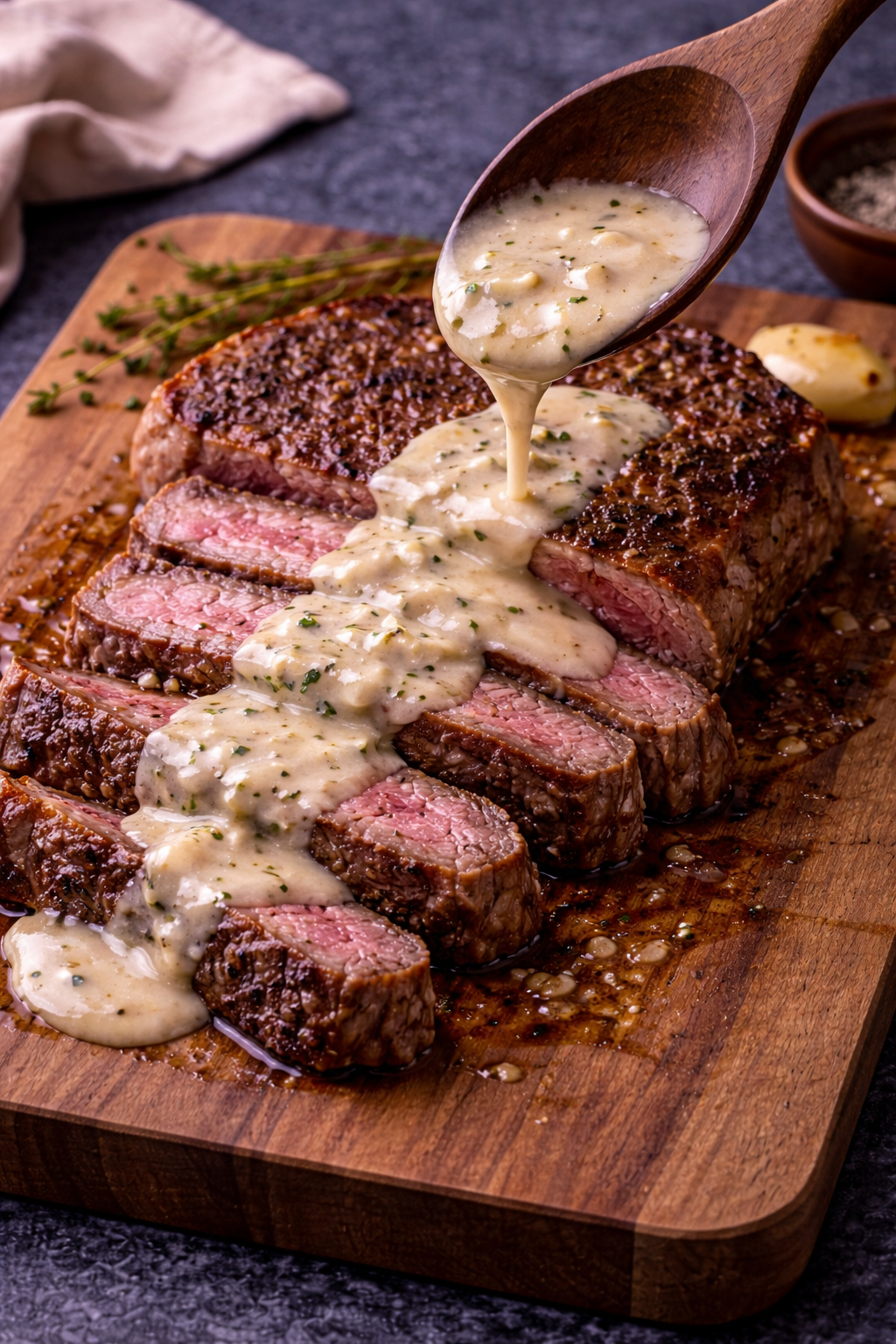 - Pour the warm sauce over the steak and serve immediately.