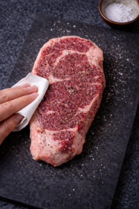 - Pat it dry and season both sides with salt (and pepper if using).