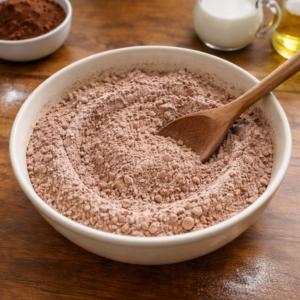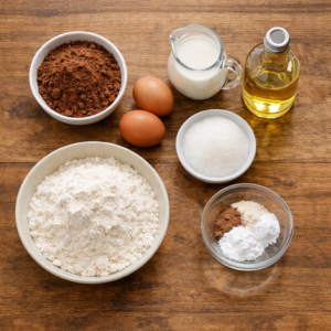 Basic flour gives structure. Cocoa powder brings that strong chocolate taste people actually want. Sugar balances bitterness. Eggs hold everything together. Oil keeps the texture soft instead of dry. Milk smooths the batter. Baking powder and baking soda do the rising work. Vanilla adds depth without trying to steal attention. A pinch of salt keeps the flavor grounded.