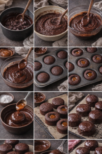 1. I started by melting the chocolate slowly and gently, letting the kitchen stay quiet. I mixed the batter without rushing, keeping everything soft and smooth. After preparing the small cakes, I added caramel in the center, baked them until just set, and let them rest. Once cooled slightly, I coated them in melted dark chocolate and let them set again.